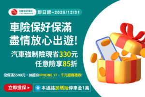 【📬 中信產險|投保汽\機車險抽好禮】滿 500元 抽IPHONE17、千元超商禮券!通路加碼抽停車金 1萬元!-停車大聲公投保汽/機車滿500元就有機會抽中 iPhone 17、千元超商禮券,還有停車大聲公通路限定加碼——再抽停車金 1 萬元! 【📬 中信產險|投保汽\機車險抽好禮】滿 500元 抽IPHONE17、千元超商禮券!通路加碼抽停車金 1萬元!-停車大聲公2025-11-11 【⏰ 中信產險|預約愛車小秘書】填車牌資料送CITY咖啡,並獲自動到期前通知服務!-停車大聲公2025-11-11 【 新安東京海上|限時登錄優惠 】 停車大聲公攜手新安東京海上,輸入專屬活動代碼【PKLOT】90天訂閱+停車金限時搶! -停車大聲公2025-11-05 【🫎 創星保經】完成車險投保,不只保障升級,還有好康三重送等您拿! -停車大聲公2025-10-01